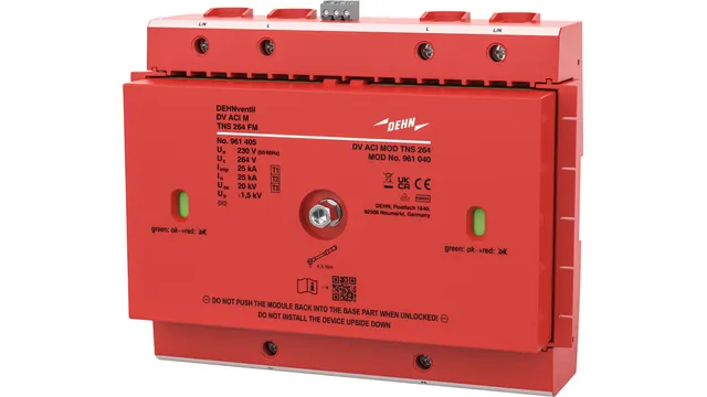 Czterobiegunowy kombinowany ogranicznik przepięć DEHNventil ACI M TNS, typu 1 + typu 2 + typu 3 zgodnie z EN 61643-11 na bazie iskierników z wbudowanym wyłącznikiem ACI i iskiernikiem. Maksymalna dostępność instalacji. Umożliwia ochronę urządzenia końcowego.