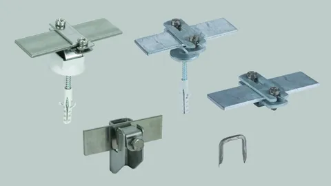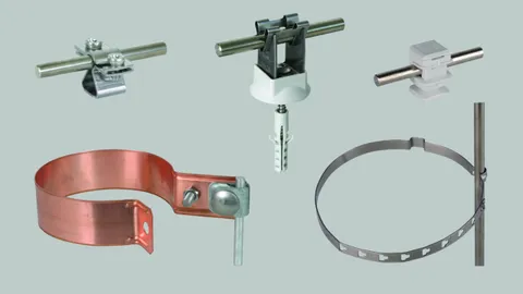 Conductor systems for flat roofs, roof surfaces, metal roofs, ridge tiles and hip tiles for fixing round and flat conductors on different types of roofs or on the facade.