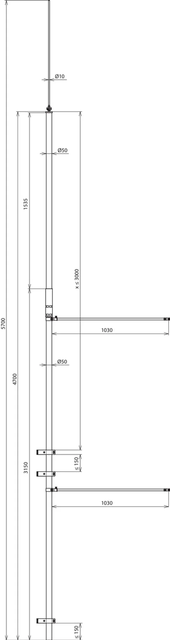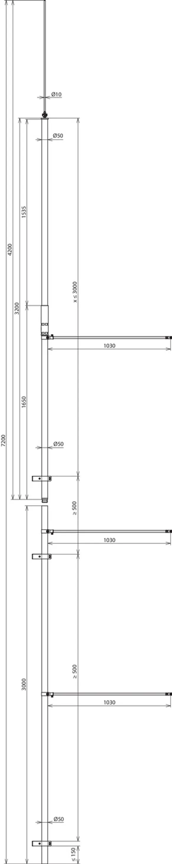 | Maksymalne obciążenie wiatrem | (montaż na ścianie dla maksymalnej długości swobodnej 3500 mm, Ø8 mm) 232 km/h |