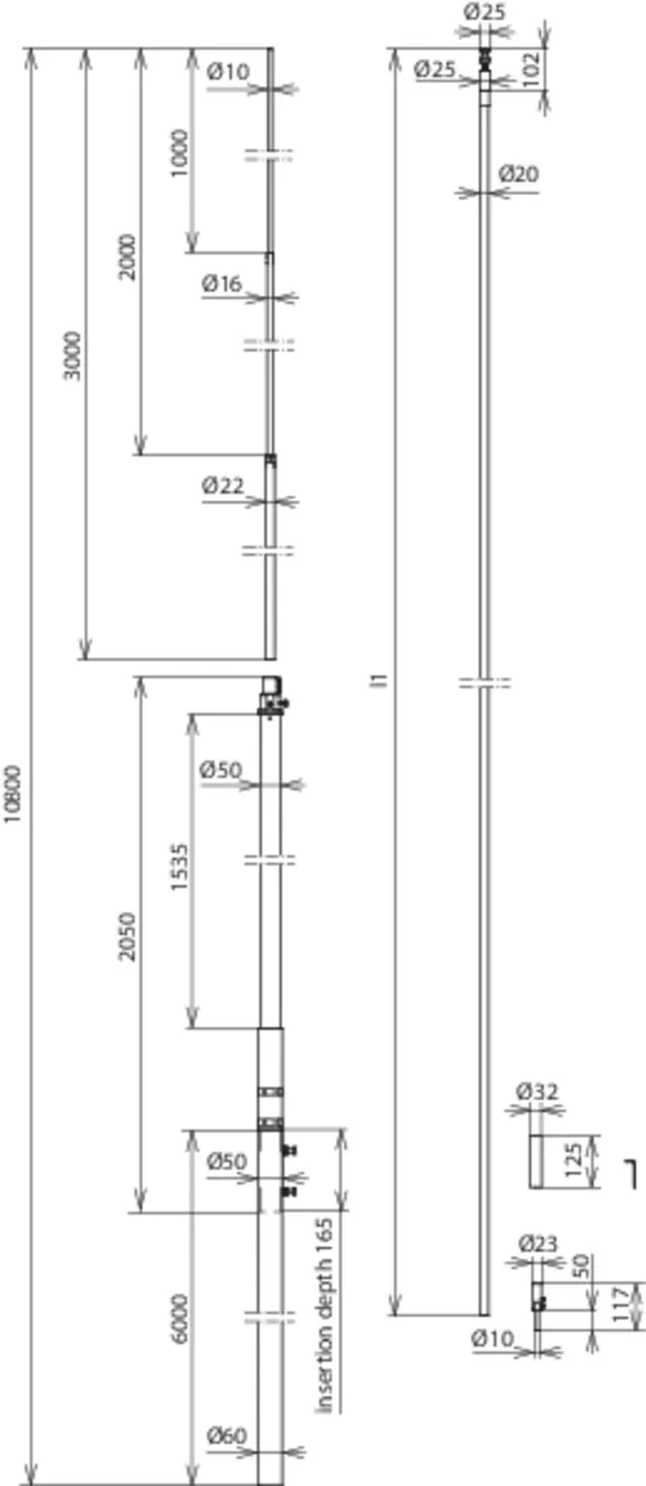 Modułowy maszt odgromowy składa się z następujących elementów: – Iglica odgromowa, aluminium, Ø22 / 16 / 10 mm, długość 3000 mm – Rura wsporcza, GRP/aluminium, Ø50 / 60 mm, długość 2100 mm (głębokość wkładania 200 mm) – Rura masztowa, stal HDG, Ø60 mm, długość 6000 mm, ze śrubami blokującymi M10 ze stali nierdzewnej – Przewód HVI power poprowadzony wewnątrz – Długość transportowa 6000 mm
