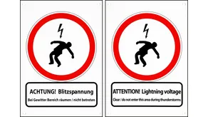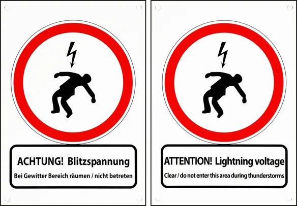 Tabliczka ostrzegawcza o prądzie piorunowym Tabliczka ostrzegawcza Nadruk z przodu w języku niemieckim: „ACHTUNG! Blitzspannung Bei Gewitter Bereich räumen / nicht betreten” Nadruk z tyłu w języku angielskim: "ATTENTION! Lightning voltage Clear / do not enter this area during thunderstorms"