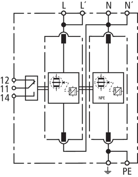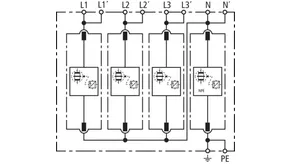 Zestaw składający się z gotowych do podłączenia ograniczników przepięć i prądu piorunowego, w tym izolowanej szyny okablowania modułu do użytku w systemach falowników z aktywnym układem przeciwdziałania degradacji indukowanej napięciem (Anti-PID) i maksymalnym przesunięciem DC na poziomie 750 V DC. Podłączenie instalacji uziemiających zgodnie z IEC 60364-4-44, tabela 44.A1 – połączone RE i Z oraz RE i RA.