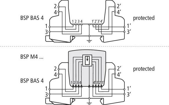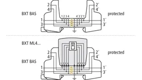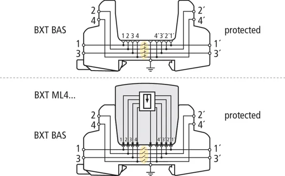 Podstawa BLITZDUCTOR XT to uniwersalny 4-biegunowy zacisk przelotowy o kompaktowej budowie do montażu modułów ochronnych bez rozłączania sygnału roboczego. Mechanizm zatrzaskowy podstawy zapewnia bezpieczne uziemienie modułu ochronnego poprzez szynę DIN (TH 35). Ponieważ żaden element obwodu ochronnego nie znajduje się w podstawie, dlatego kontrola okresowa jest ograniczona