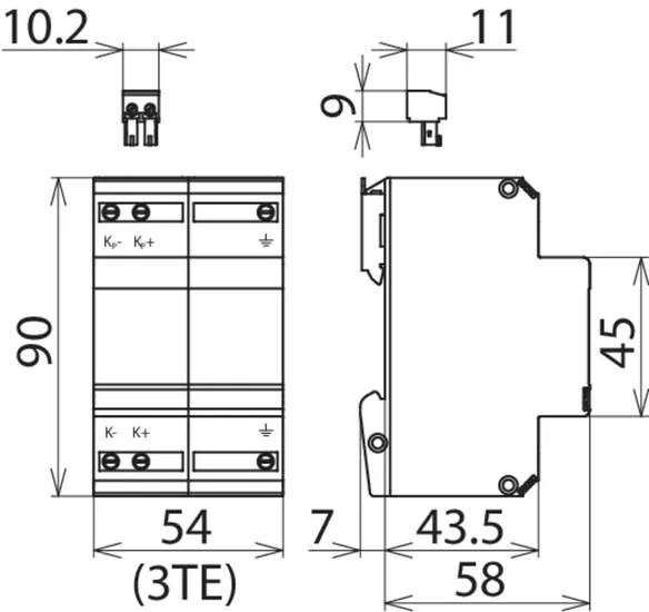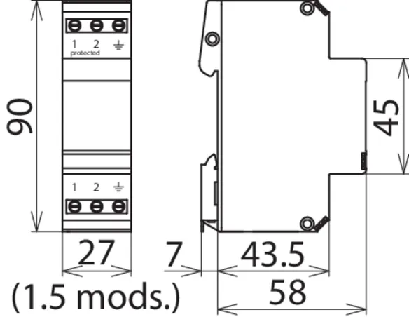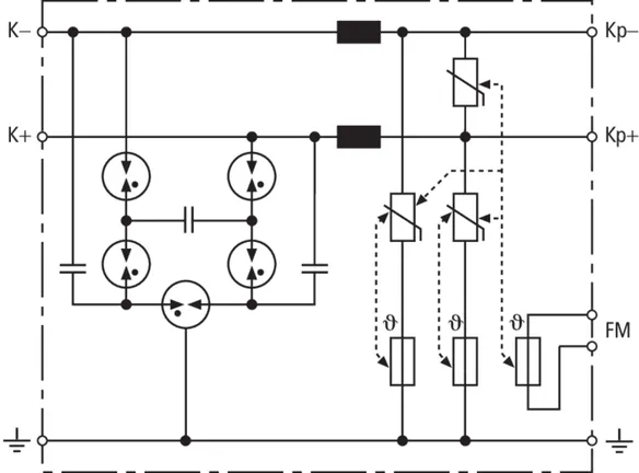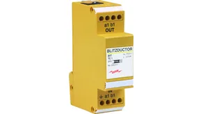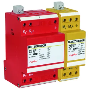 Skoordynowany energetycznie ogranicznik kombinowany do ochrony prostownika w obwodzie ochronnym (kolor czerwony). Wtykowy zestyk zdalnej sygnalizacji (zestyk rozwierny) do informowania o przeciążeniu (kontrola temperatury warystorów). Zalecany montaż w obudowie z blachy stalowej. Niskie udarowe napięcie przeskoku dzięki sterowaniu pojemnościowemu.