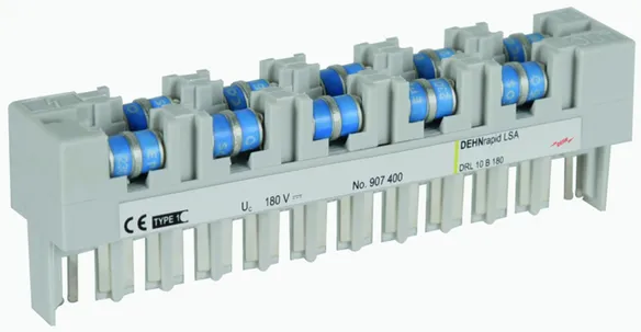 Ogranicznik przepięć DRL 10 B (w magazynku DRL) z trójbiegunowymi iskiernikami gazowymi, wytrzymały na prąd piorunowy, dla 10 par dowolnego zastosowania z możliwością dołączenia ochrony "drugiego stopnia” w postaci wtyków ochronnych.