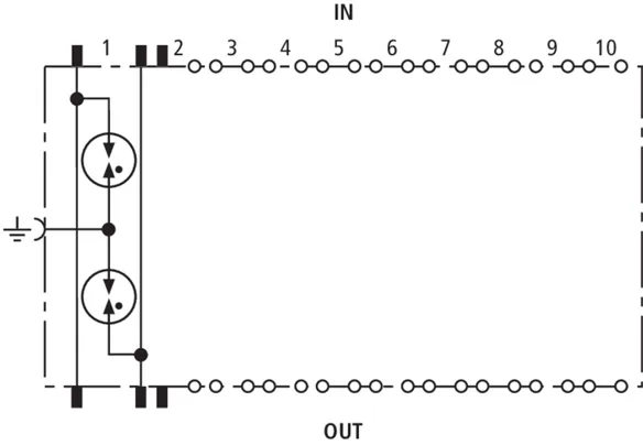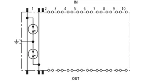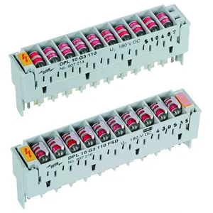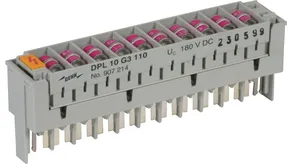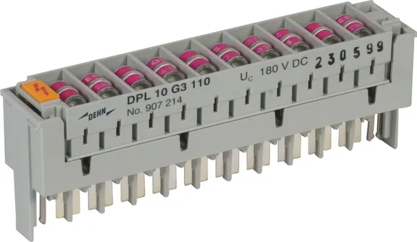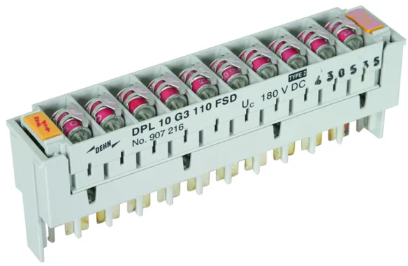 Magazynek na ograniczniki na 10 podwójnych żył z trójbiegunowymi iskiernikami gazowymi do niemal wszystkich zastosowań. Ograniczniki FSD posiadają funkcję fail-safe i dodatkowy optyczny wskaźnik stanu po wyzwoleniu zabezpieczenia fail-safe. W ten sposób można natychmiast rozpoznać, czy ogranicznik wymaga wymiany.
