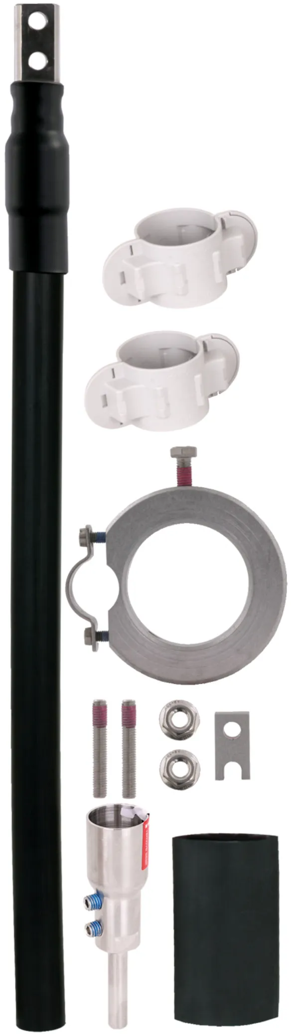 Zestaw przyłączeniowy do przewodu HVI power do układania na rurach wsporczych HVI power GRP / Al, składający się ze sworzni gwintowanych, części przyłączeniowych, koszulki termokurczliwej i pierścienia mocującego z uchwytem kablowym (Ø27 mm) ze szczeliną do końcówki przyłączeniowej (wraz z opaską kablową).