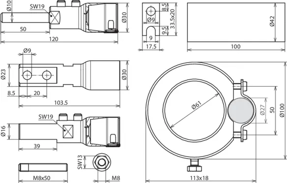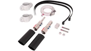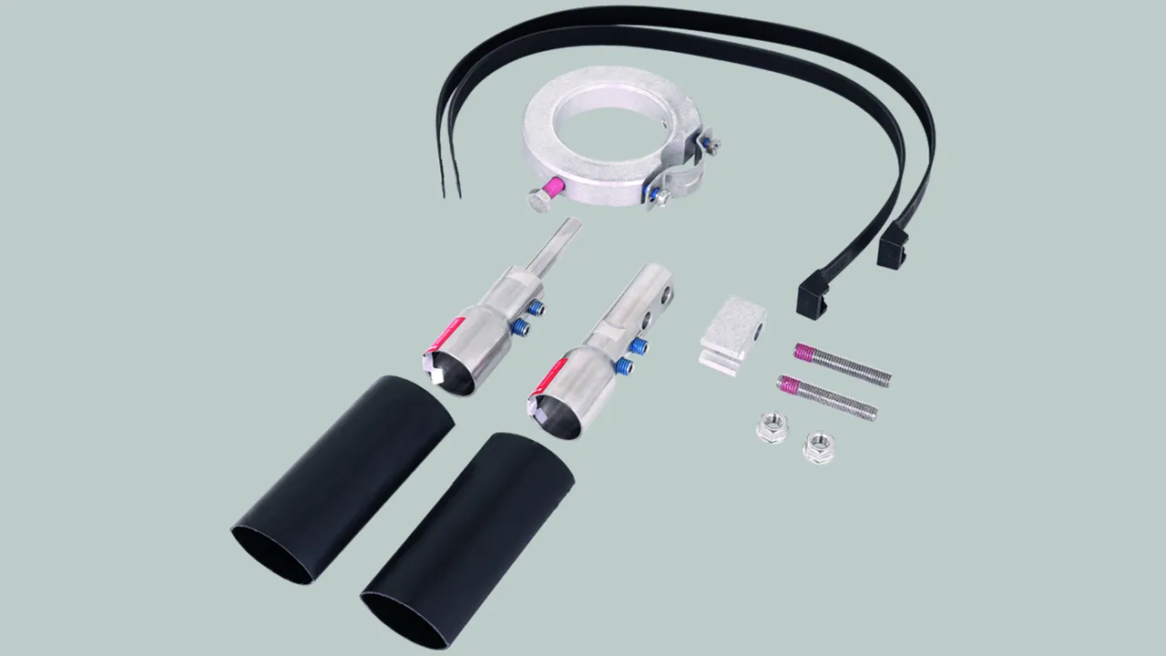 Zestaw przyłączeniowy do przewodu HVI power do układania na rurach wsporczych HVI power GRP / Al, składający się z elementów przyłączeniowych, sworzni gwintowanych, części przyłączeniowych, koszulki termokurczliwej, opaski kablowej i pierścienia mocującego z uchwytem kablowym (Ø27 mm) ze szczeliną.