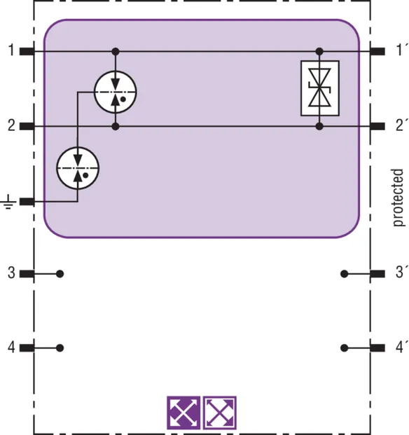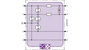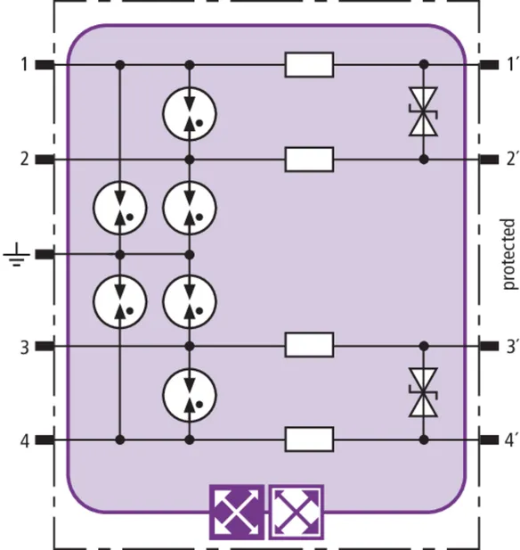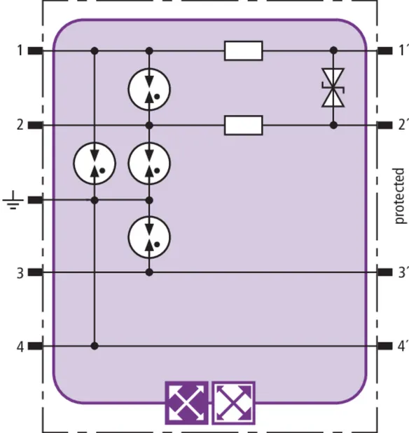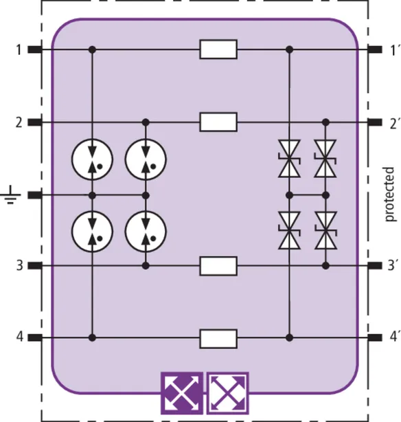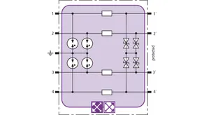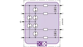 Kompaktowy moduł ochronny do ograniczników przepięć, z systemem LifeCheck, do ochrony maksymalnie 4 nieuziemionych pojedynczych linii ze wspólnym potencjałem odniesienia iskrobezpiecznych obwodów pomiarowych, spełnia wymagania FISCO. Certyfikat ATEX. Wytrzymałość izolacji > 500 V linia-ziemia. Jeśli system LifeCheck wykryje przeciążenie termiczne lub elektryczne, ogranicznik należy wymienić. Stan ten jest sygnalizowany bezdotykowo do czytnika DEHNrecord LC / SCM / MCM.