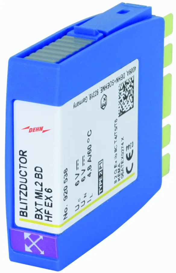 Kompaktowy moduł ochronny do ograniczników przepięć, z systemem LifeCheck, do ochrony dwóch par iskrobezpiecznych obwodów pomiarowych i systemów magistralnych, spełnia wymagania FISCO. Certyfikat ATEX. Wytrzymałość izolacji > 500 V linia-ziemia. Jeśli system LifeCheck wykryje przeciążenie termiczne lub elektryczne, ogranicznik należy wymienić. Stan ten jest sygnalizowany bezdotykowo do czytnika DEHNrecord LC / SCM / MCM.