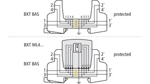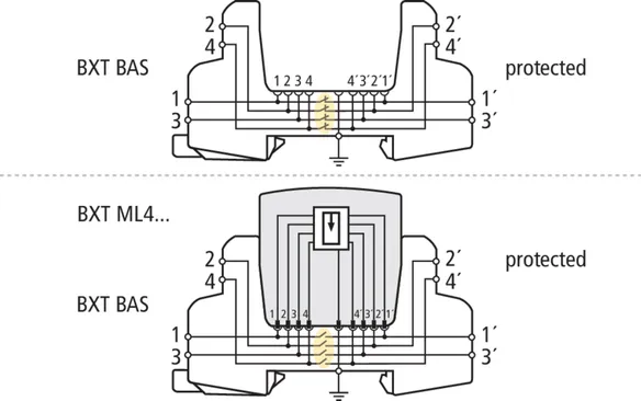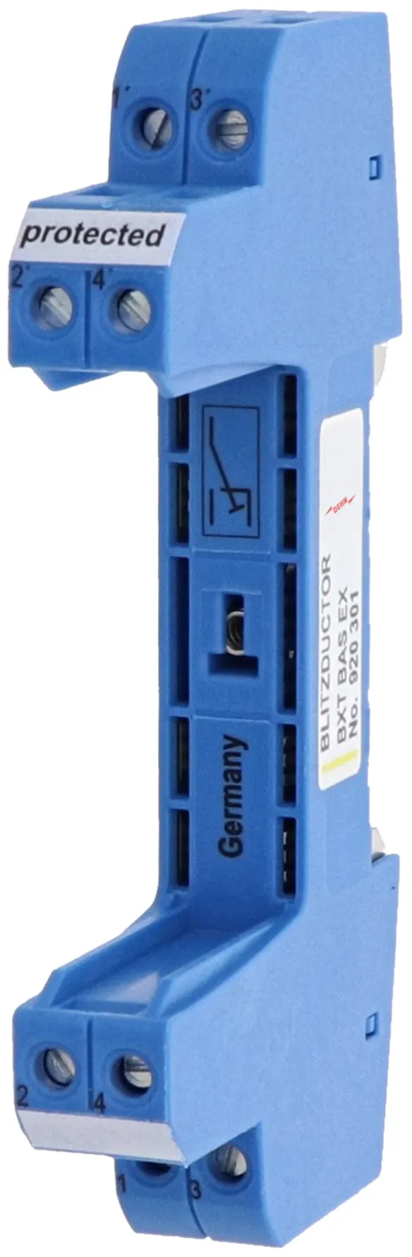 Podstawa BLITZDUCTOR XT to uniwersalny 4-biegunowy zacisk przelotowy o kompaktowej budowie do montażu modułów ochronnych w obwodach iskrobezpiecznych, bez rozłączania sygnału roboczego w przypadku wyciągnięcia modułu ochronnego z podstawy. Mechanizm zatrzaskowy podstawy zapewnia bezpieczne uziemienie modułu ochronnego poprzez szynę DIN (TH 35). Ponieważ żaden element obwodu ochronnego nie znajduje się w podstawie, dlatego kontrola okresowa jest ograniczona tylko do modułów ochronnych.