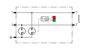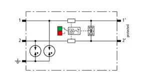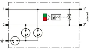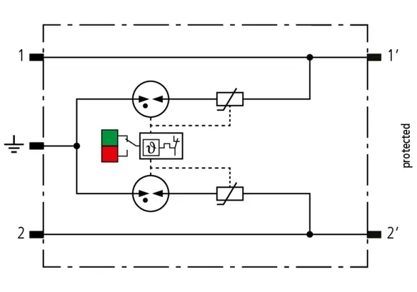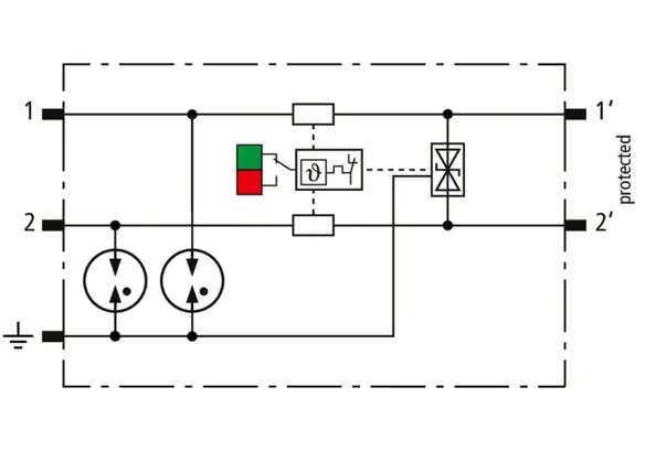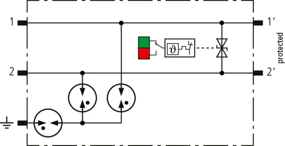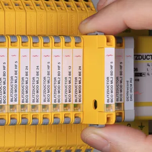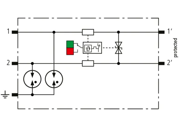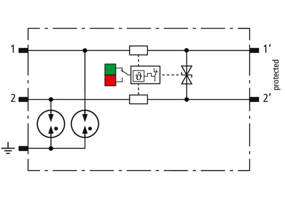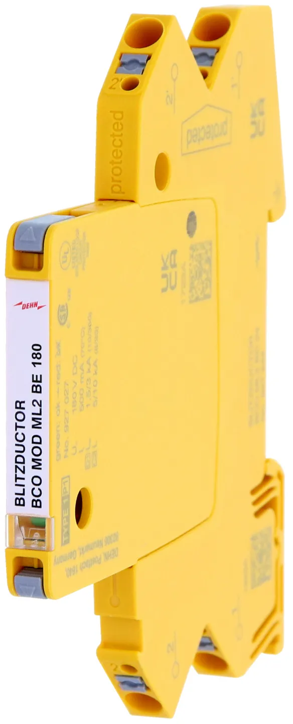 Kompaktowy modułowy ogranicznik przepięć o szerokości 6 mm, z podłączeniem przewodów w technice wtykowej ("push-in"), ze wskaźnikiem stanu, do ochrony dwóch pojedynczych linii do piorunowego wyrównania potencjałów oraz pośredniego uziemienia kabli ekranowanych. Z odłączeniem sygnału na czas konserwacji.