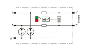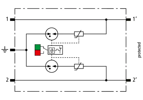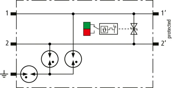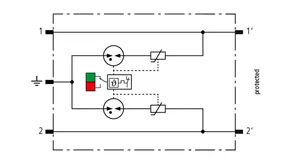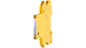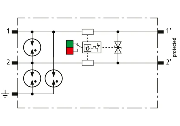 Kompaktowy kombinowany ogranicznik przepięć z modułami wymiennymi o szerokości 6 mm, z podłączeniem przewodów w technice wtykowej („push-in”), ze wskaźnikiem stanu, do ochrony 1 pary linii w sieciach 24 V DC. Może być również stosowany w instalacjach z uziemionymi biegunami ujemnymi. Wbudowane rezystory PTC pozwalają niezawodnie zresetować ogranicznik po wystąpieniu w obwodzie prądów zwarciowych do 40 A. Z odłączeniem sygnału na czas konserwacji.