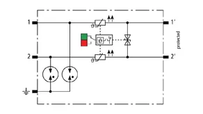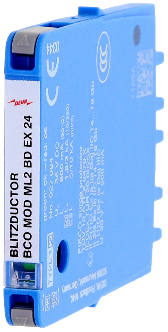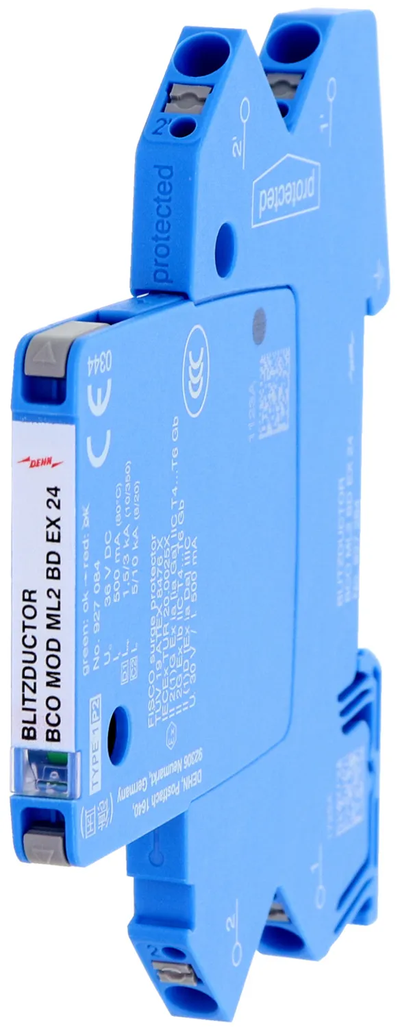 Kompaktowy modułowy ogranicznik przepięć o szerokości 6 mm, z podłączeniem przewodów w technice wtykowej ("push-in"), ze wskaźnikiem stanu, do ochrony jednej pary iskrobezpiecznych obwodów pomiarowych i systemów magistralnych, spełnia wymagania FISCO. Wytrzymałość izolacji > 500 V linia-ziemia. Z odłączeniem sygnału na czas konserwacji.