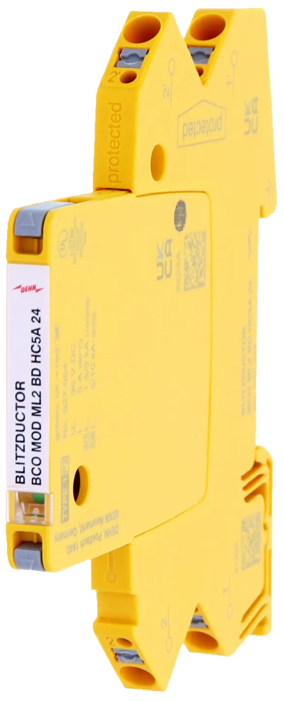 Moduł ochronny o szerokości 6 mm do ogranicznika przepięć BLITZDUCTORconnect ze wskaźnikiem stanu, do ochrony 1 pary linii w sieciach 24 V DC. Może być również stosowany w instalacjach z uziemionymi biegunami ujemnymi. Wbudowane rezystory PTC pozwalają niezawodnie zresetować ogranicznik po wystąpieniu w obwodzie prądów zwarciowych do 40 A.