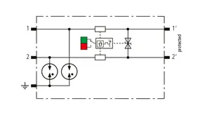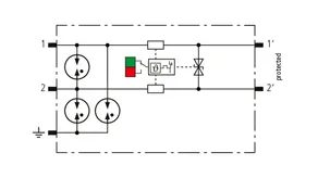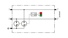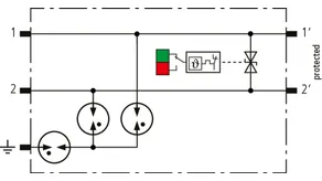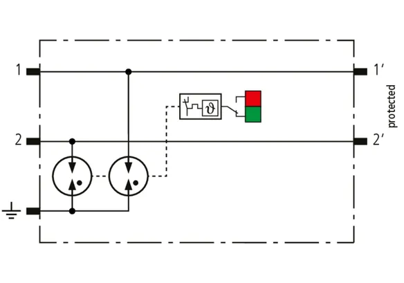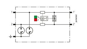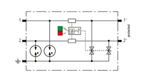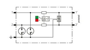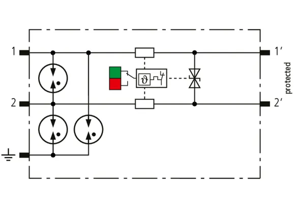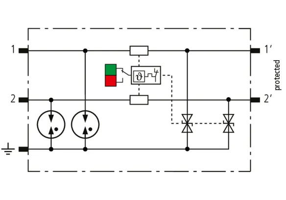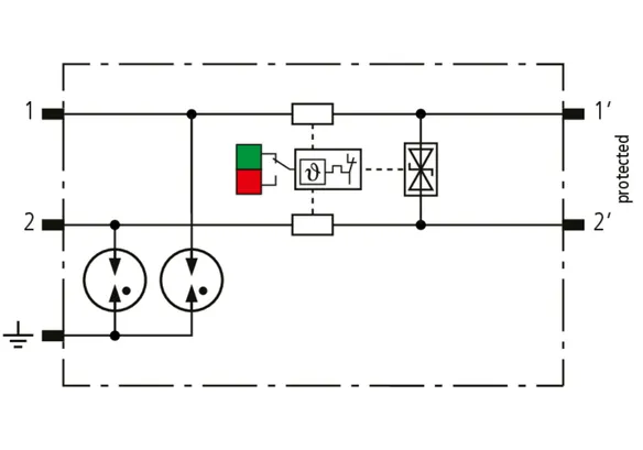 Kompaktowy modułowy ogranicznik przepięć o szerokości 6 mm, z podłączeniem przewodów w technice wtykowej ("push-in"), ze wskaźnikiem stanu, do ochrony dwóch pojedynczych linii do piorunowego wyrównania potencjałów oraz pośredniego uziemienia kabli ekranowanych. Z odłączeniem sygnału na czas konserwacji.