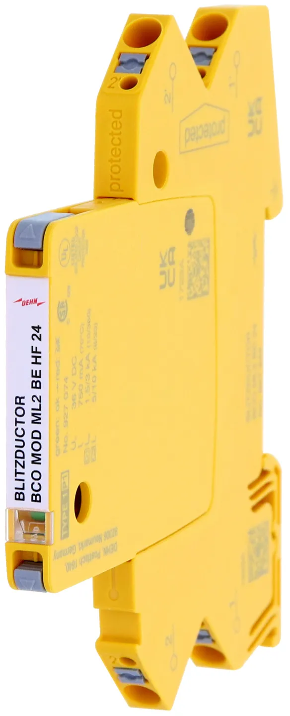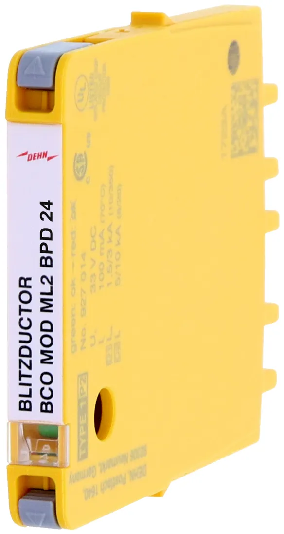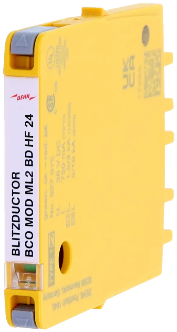 Moduł ochronny o szerokości 6 mm do ogranicznika przepięć BLITZDUCTORconnect ze wskaźnikiem stanu, do ochrony 1 pary linii w sieciach 24 V DC. Może być również stosowany w instalacjach z uziemionymi biegunami ujemnymi. Wbudowane rezystory PTC pozwalają niezawodnie zresetować ogranicznik po wystąpieniu w obwodzie prądów zwarciowych do 40 A.