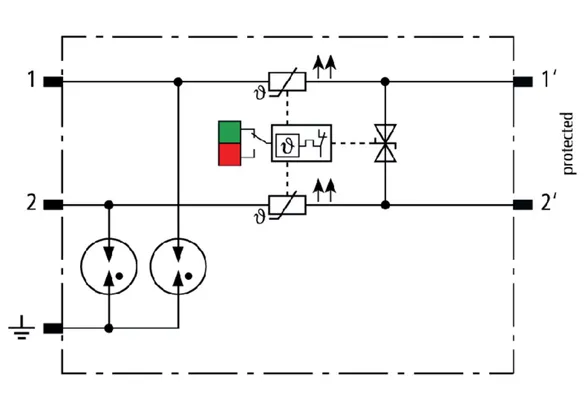 Kompaktowy kombinowany ogranicznik przepięć z modułami wymiennymi o szerokości 6 mm, z podłączeniem przewodów w technice wtykowej („push-in”), ze wskaźnikiem stanu, do ochrony 1 pary linii w sieciach 24 V DC. Może być również stosowany w instalacjach z uziemionymi biegunami ujemnymi. Wbudowane rezystory PTC pozwalają niezawodnie zresetować ogranicznik po wystąpieniu w obwodzie prądów zwarciowych do 40 A. Z odłączeniem sygnału na czas konserwacji.