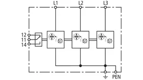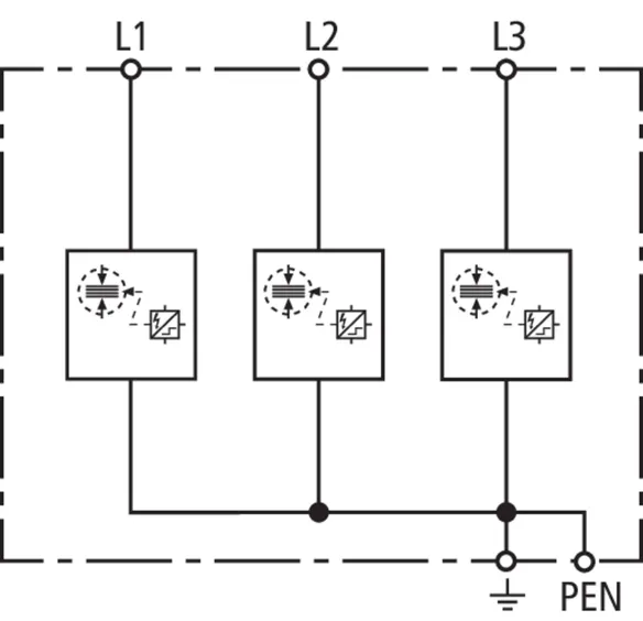 Gotowy do podłączenia, zoptymalizowany pod kątem zastosowania kombinowany ogranicznik przepięć do sieci TN-C do stosowania w rozdzielnicy głównej (układ połączeń „3+0") budynków mieszkalnych bez zewnętrznego urządzenia piorunochronnego (także z zasilaniem napowietrznym); z bezpotencjałowym zestykiem przełącznym.