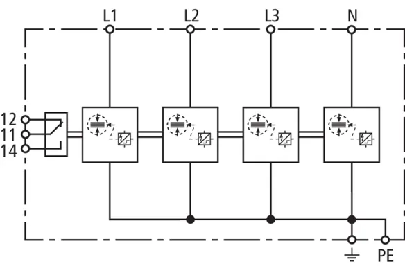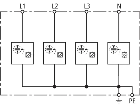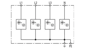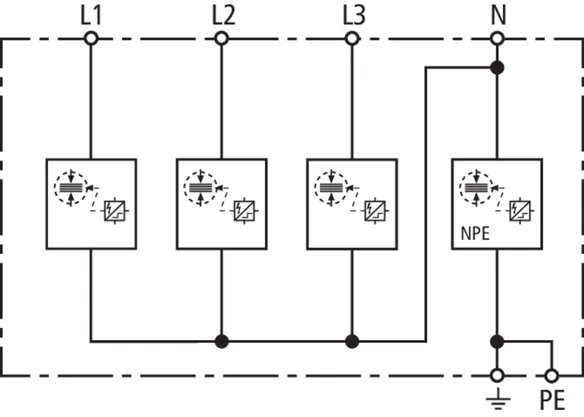 Gotowy do podłączenia, zoptymalizowany pod kątem zastosowania kombinowany ogranicznik przepięć do sieci TN-S do stosowania w rozdzielnicy głównej (układ połączeń „4+0") budynków mieszkalnych bez zewnętrznego urządzenia piorunochronnego (także z zasilaniem napowietrznym); z bezpotencjałowym zestykiem przełącznym.