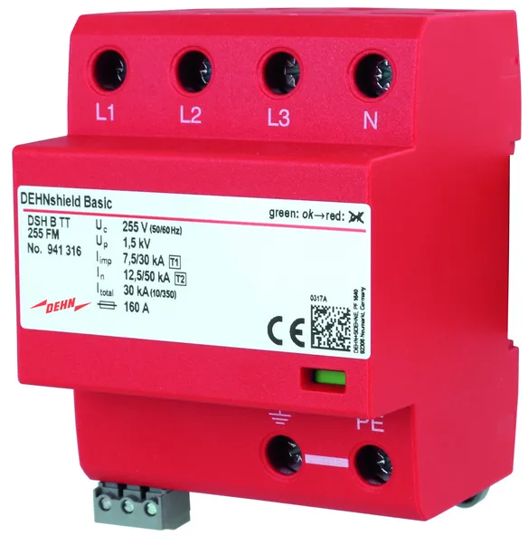 Gotowy do podłączenia, zoptymalizowany pod kątem zastosowania kombinowany ogranicznik przepięć do sieci TT i TN-S do stosowania w rozdzielnicy głównej (układ połączeń "3+1") budynku mieszkalnego bez zewnętrznego urządzenia piorunochronnego (także z zasilaniem napowietrznym); z bezpotencjałowym zestykiem przełącznym.