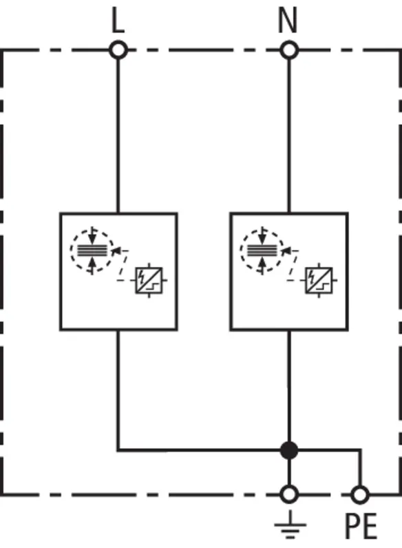 Gotowy do podłączenia, zoptymalizowany pod kątem zastosowania kombinowany ogranicznik przepięć do jednofazowych sieci TN do stosowania w rozdzielnicy głównej (układ połączeń „2+0") budynków mieszkalnych bez zewnętrznego urządzenia piorunochronnego (także z zasilaniem napowietrznym); z bezpotencjałowym zestykiem przełącznym.