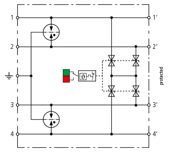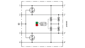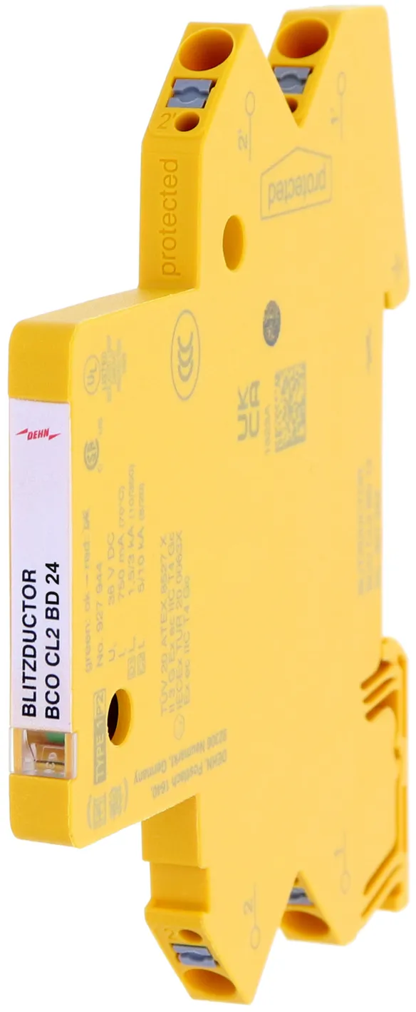 Kompaktowy ogranicznik przepięć o szerokości 6 mm, z podłączeniem przewodów w technice wtykowej („push-in”), ze wskaźnikiem stanu. Jednostopniowe urządzenie z wydajnymi diodami precyzyjnie ograniczające przepięcia do ochrony dwóch pojedynczych linii o wspólnym potencjale odniesienia i interfejsów niesymetrycznych.