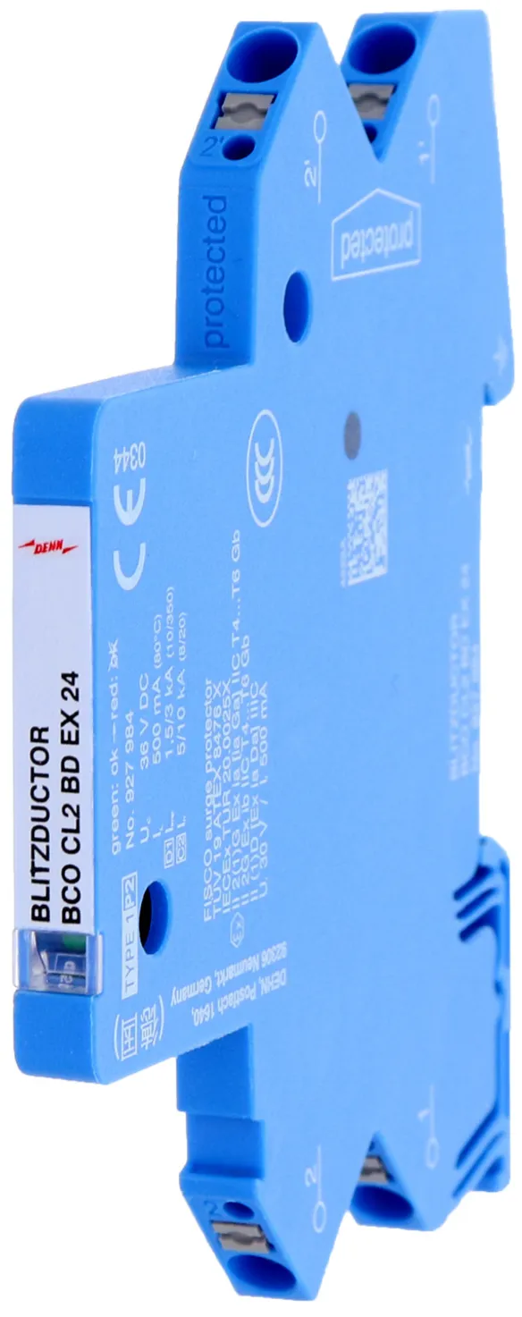 Kompaktowy ogranicznik przepięć o szerokości 6 mm, z podłączeniem przewodów w technice wtykowej ("push-in"), ze wskaźnikiem stanu, do ochrony jednej pary iskrobezpiecznych obwodów pomiarowych i systemów magistralnych, spełnia wymagania FISCO. Wytrzymałość izolacji > 500 V linia-ziemia.