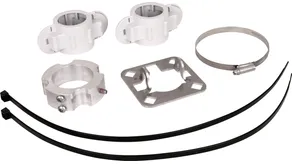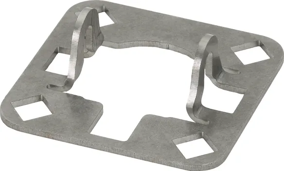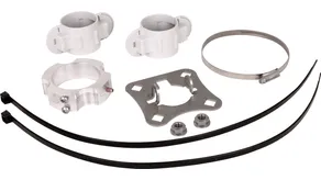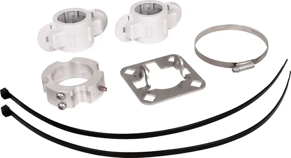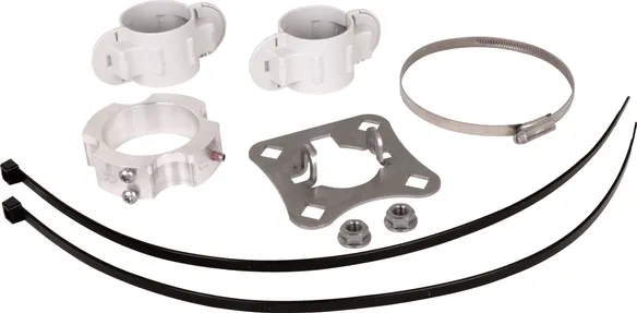 Zestaw mocujący do montażu przewodu HVI light plus na rurach wsporczych Ø50 mm, składający się z płytki przyłączeniowej i pierścienia mocującego z obejmą zaciskową ze stali nierdzewnej do końcówki przyłączeniowej (wraz z czterema obejmami z tworzywa sztucznego i dwoma opaskami kablowymi).